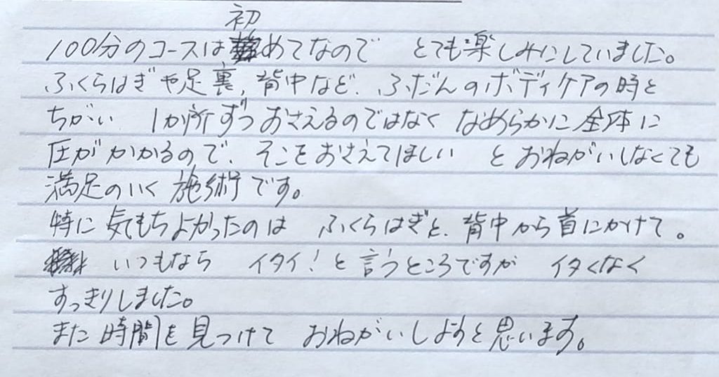 ふくらはぎや足裏、背中など、普段のボディケアの時と違い、一か所ずつおさえるのではなく、なめらかに全体に圧がかかるので、そこを抑えてほしいとお願いしなくても満足のいく施術です。