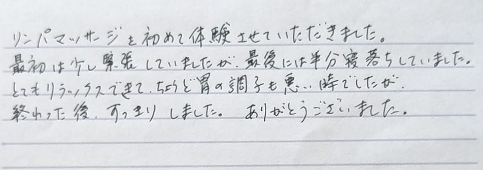 とてもリラックスできて、ちょうど胃の調子も悪い時でしたが、終わった後はすっきりしました。